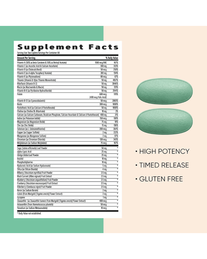 Each caplet features Vitamin D3 with Calcium, Magnesium, and Vitamin K to support bone strength and mobility, while a robust B-complex (B6 & B12) helps your body convert food into energy for day-to-day activity. Vitamins C & D3 with Zinc back your immune system, and antioxidants A, C, E, and Selenium provide cellular support for eye and skin wellness.